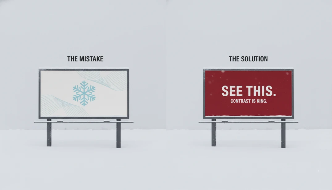 چرا غلطه؟ چون آسمون زمستون سفید و خاکستریه. برف و مه سفیدن. اگه بیلبورد شما هم سفید باشه، توی محیط “کاموفلاژ” (استتار) می‌شه و هیچکس نمی‌بینتش.