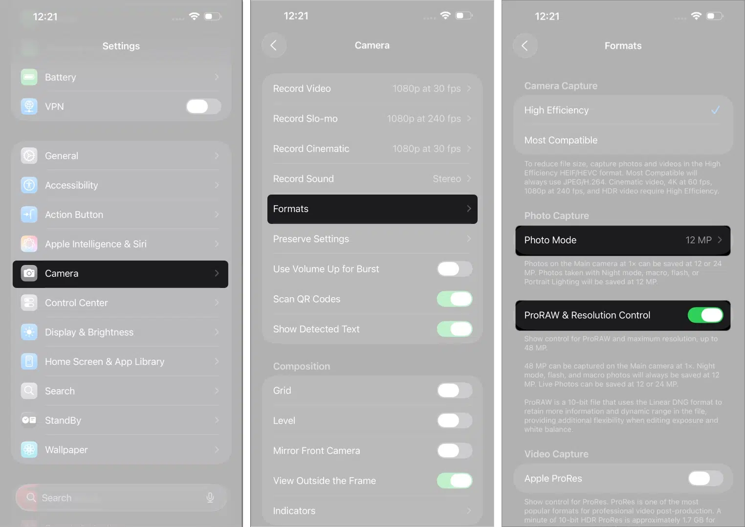 اگه آیفونت پشتیبانی میکنه، گزینه ProRAW & Resolution Control رو روشن کن تا با کیفیت 48MP عکاسی کنی. این گزینه یه عکس غنیتر و با فشردهسازی کمتر بهت میده، ولی فایلهای خیلی بزرگتری هم تولید میکنه.