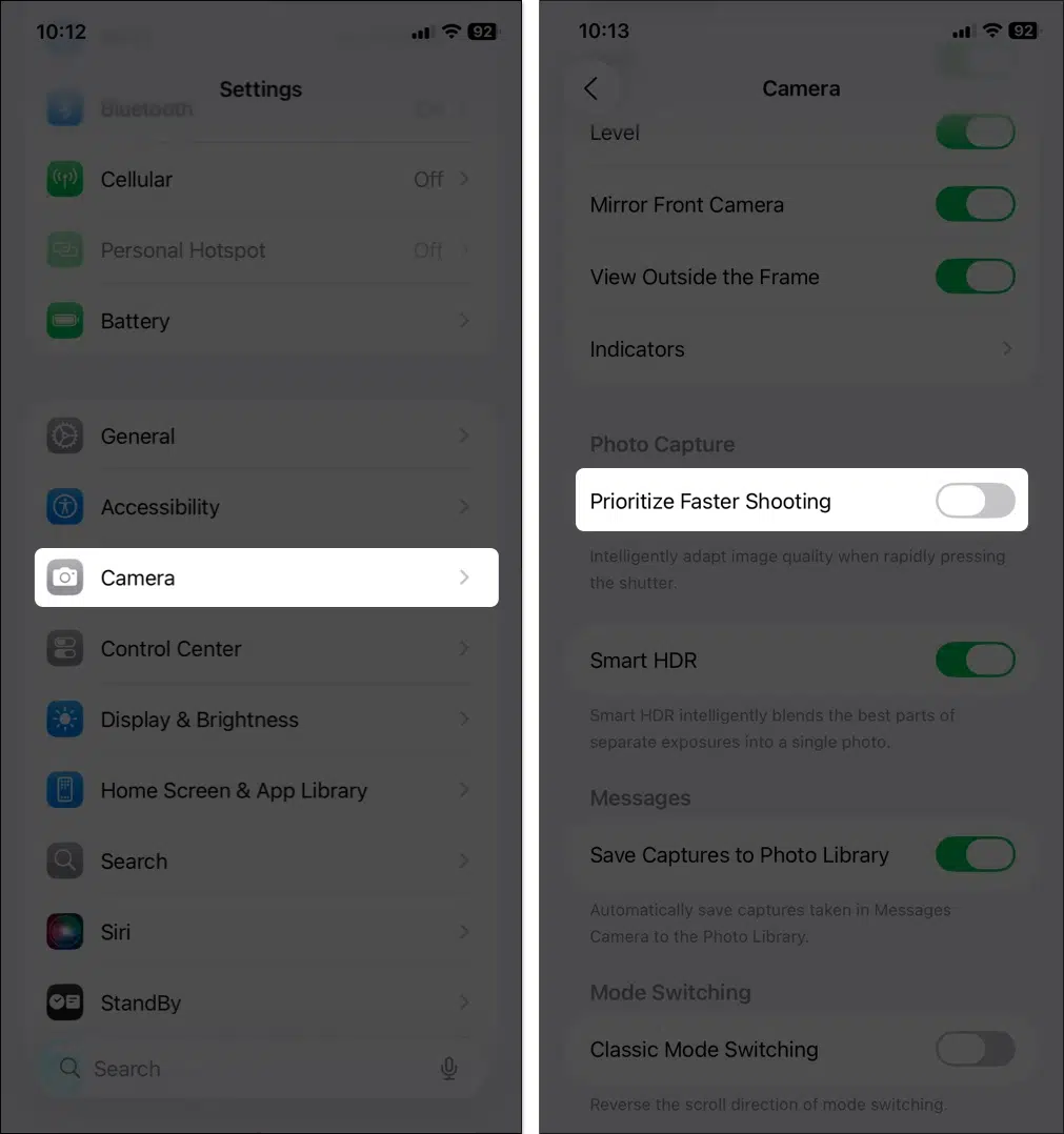 گزینه Prioritize Faster Shooting وقتی که داری تند تند دکمه شاتر رو فشار میدی، سرعت عکاسی رو بالا میبره، ولی این کار رو با کم کردن از پردازش تصویر انجام میده. اگه دنبال حداکثر شارپنس و جزئیات هستی—مخصوصاً برای عکسهای خلاقانه—خاموشش کن. برو به Settings > Camera و Prioritize Faster Shooting رو خاموش کن. این کار به آیفونت زمان بیشتری برای پردازش محاسباتی کامل میده و باعث کاهش نویز و بهبود جزئیات میشه.
