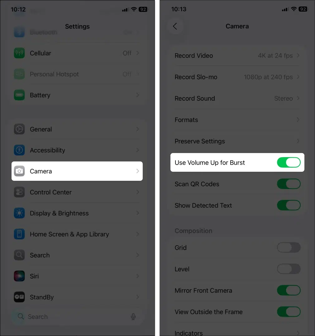 توی اپ دوربین، دکمه شاتر رو فشار بده و نگه دار تا حالت Burst شروع بشه؛ تا وقتی که ولش نکنی، به عکاسی ادامه میده. برای دسترسی راحتتر، برو به Settings > Camera و Use Volume Up for Burst رو فعال کن. بعد از اون، میتونی فقط دکمه افزایش صدا رو نگه داری تا عکسهای پیاپی بگیری.