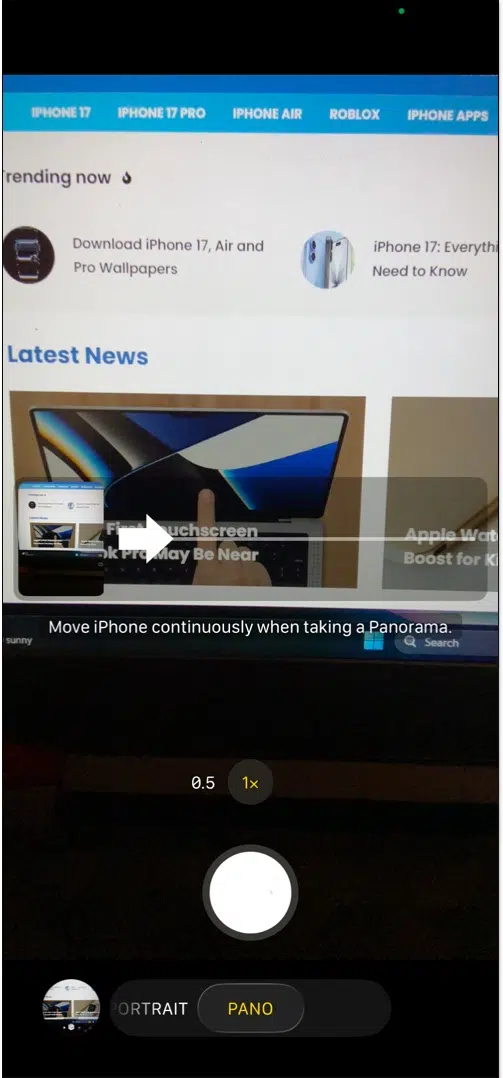 اپ دوربین رو باز کن، به حالت Pano برو و به آرومی در صحنه حرکت کن، از یه ناحیه تاریکتر شروع کن و فلش رو روی خط صاف نگه دار. میتونی وسط کار مکث کنی تا نوردهی تنظیم بشه و بعد ادامه بدی. با یه سرعت ثابت و نرم حرکت کن تا از افقهای موجدار یا اعوجاج جلوگیری کنی.