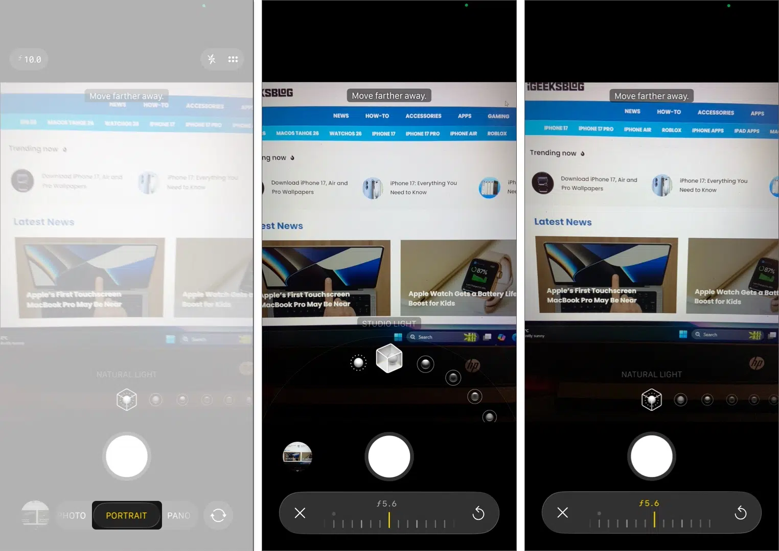 توی حالت پرتره، روی آیکون f در بالا سمت چپ بزن تا با استفاده از نوار لغزنده، میزان تاری پسزمینه رو تنظیم کنی. میتونی روی جعبه مربعی بالای دکمه شاتر به چپ هم بکشی تا یه استایل نورپردازی انتخاب کنی.